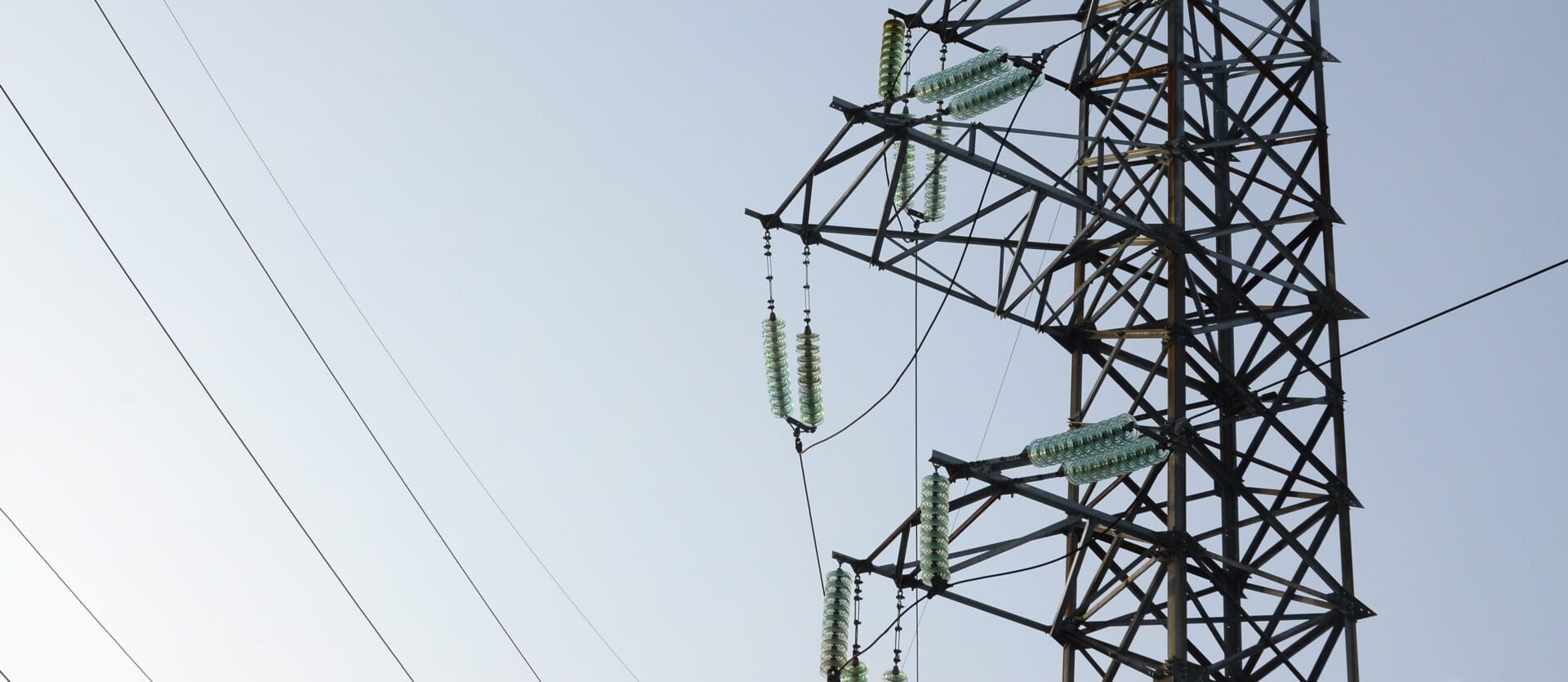 High voltage insulation string on steel pillar with electric power lines for safe delivering of electrical energy through cable wires on long distance.