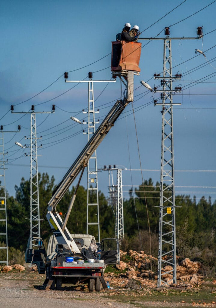 Electrical workers are making a high voltage connection. Electricity poles and cables.