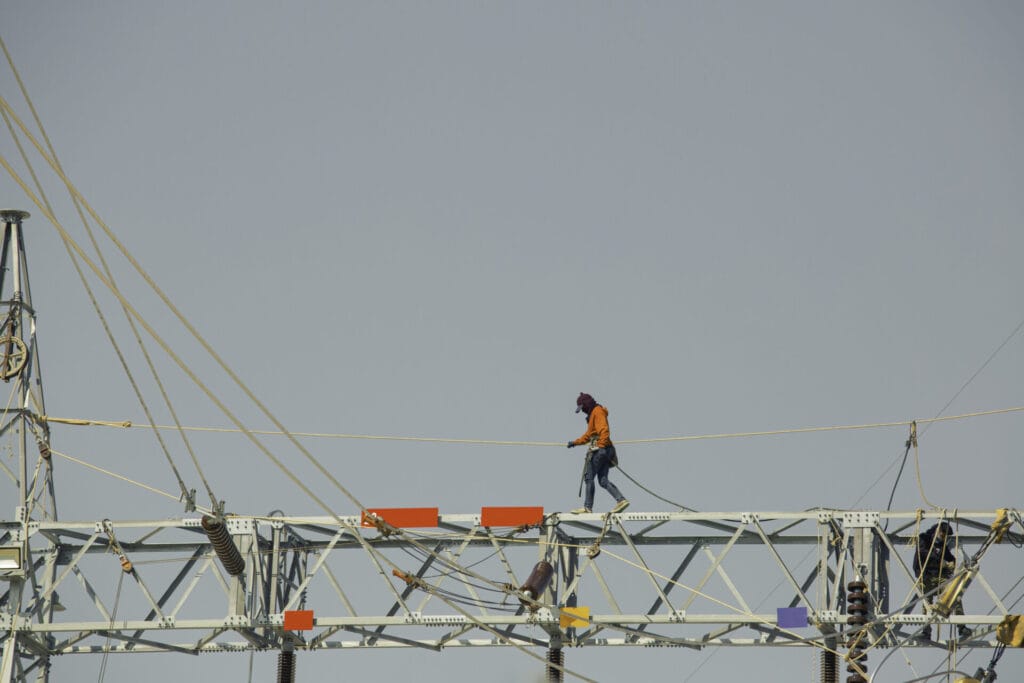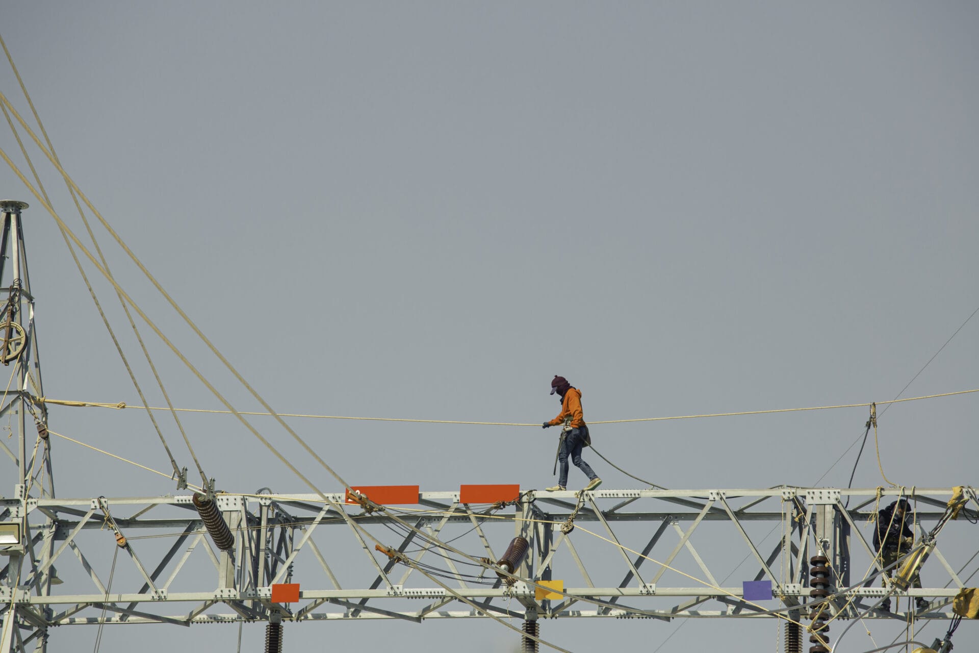 Male walking on the beam steel Installation of high-voltage transmission electricity poles the on line work at height risk should wear safety full body harness