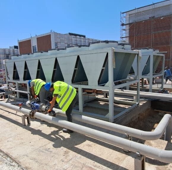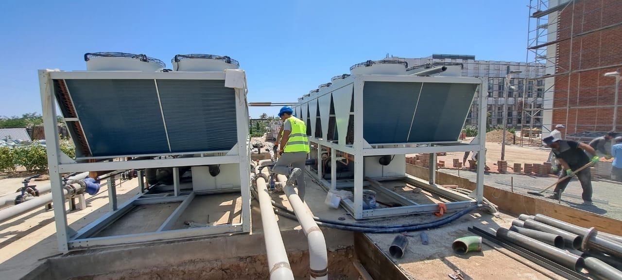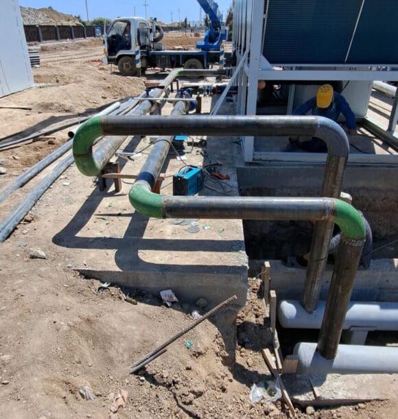 Pipe assembly and welding of chillers. Installation and welding of the boiler system of technical rooms.